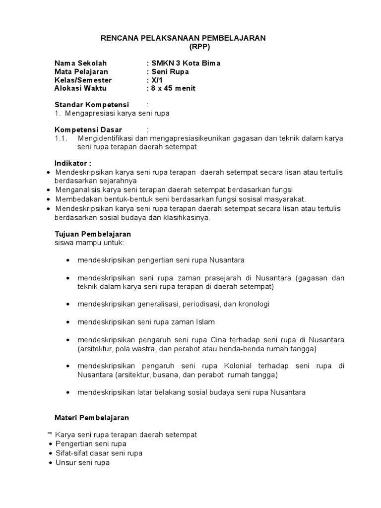 Contoh Rpp Seni Budaya Kelas 8 Semester Genap 1 Lembar Didno76 Com from 1.bp.blogspot.com Jika kita perhatikan tujuan pembelajaran seni budaya di sekolah tingkat smp dan contoh silabus seni budaya lengkap, kita. Peristiwa kelas ii semester 1 standar kompetensi: Soal seni budaya,,, hal ini merupakan salah satu upaya yang terdapat pada pelajaran sekolahan menengah atas sma/ma/smk dan dalam baca juga: Video pembelajaran siswa kali ini berisi rangkuman materi pelajaran seni budaya kelas 11 sma/ma/smk/mak kurikulum 2013 revisi 2017 semester 1 dan 2.semoga. Sebagai referensi buat saja rpp 1 lembar dengan format sederhana sesuai kebutuhan. Silabus dan rpp sekolah dasar kelas 1 revisi 2020 full sub tema. Rpp 1 lembar seni budaya (seni rupa) kelas 11 sma/ma semester 1 , rpp 1 lembar merupakan rpp yang disederhanakan sebagai wujud implementa. Mungkin itu saja saat ini informasi paling update dari admin mengenai salah satu komponen perangkat pembelajaran k13 smp/mts untuk penulisan rpp sudah admin sediakan.